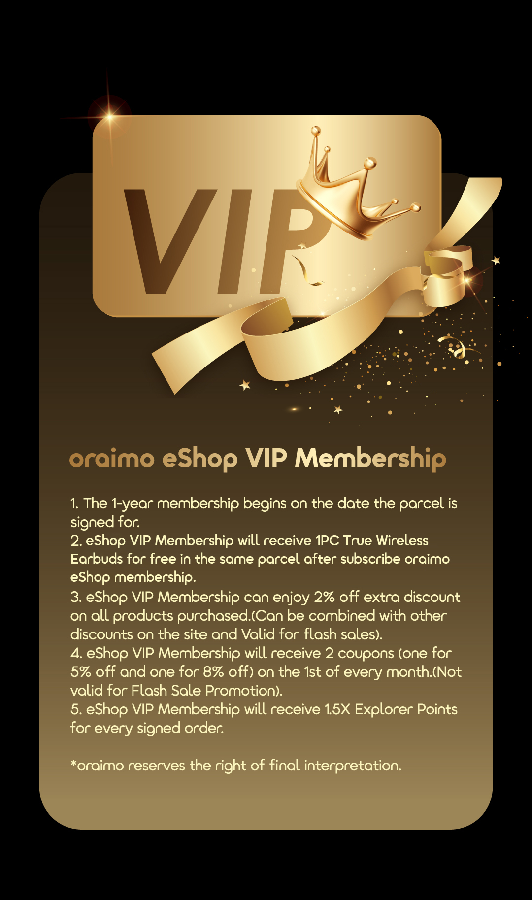 3.يمكن لأصحاب عضوية VIP في Oraimo eShop الاستفادة من خصم إضافي بنسبة 2% على جميع المنتجات