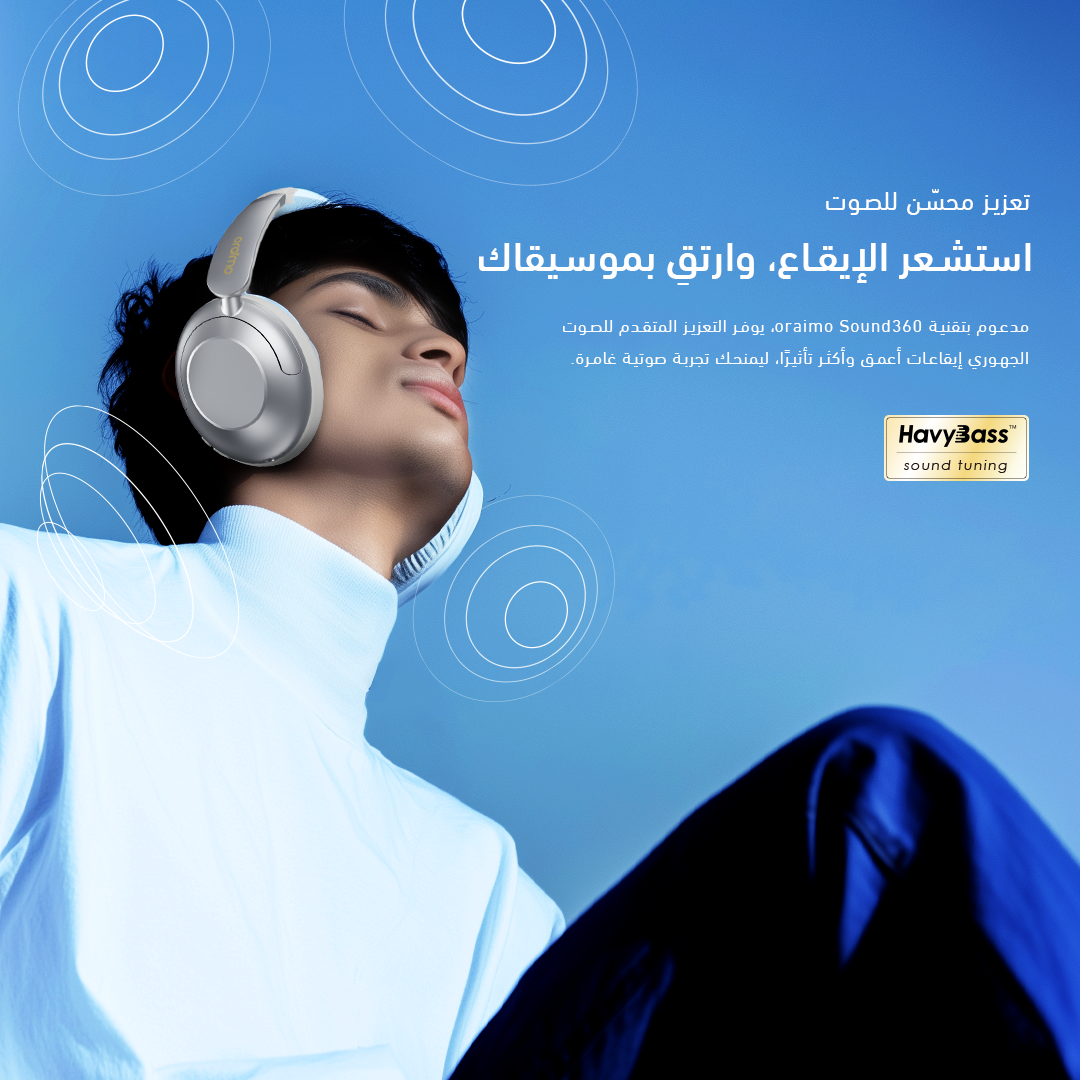 مدعومة بتقنية oraimo Sound360، تمنحك تقنية تعزيز البيز المتقدمة صوتًا أعمق وأكثر قوة، لتجربة استماع غامرة ومليئة بالتفاصيل في كل نغمة وإيقاع