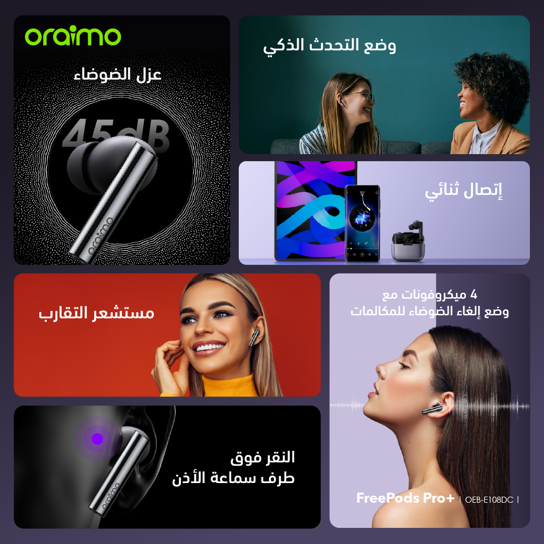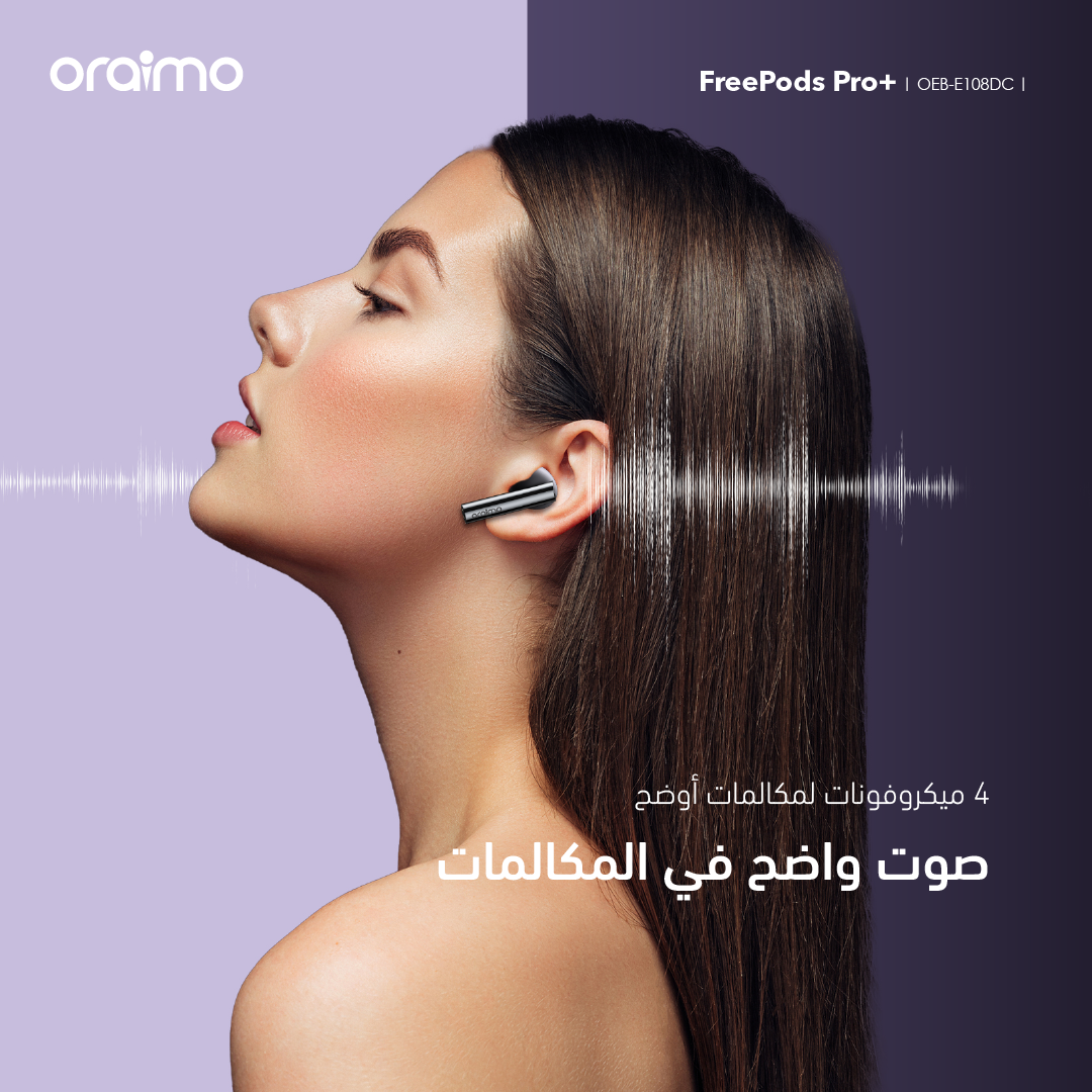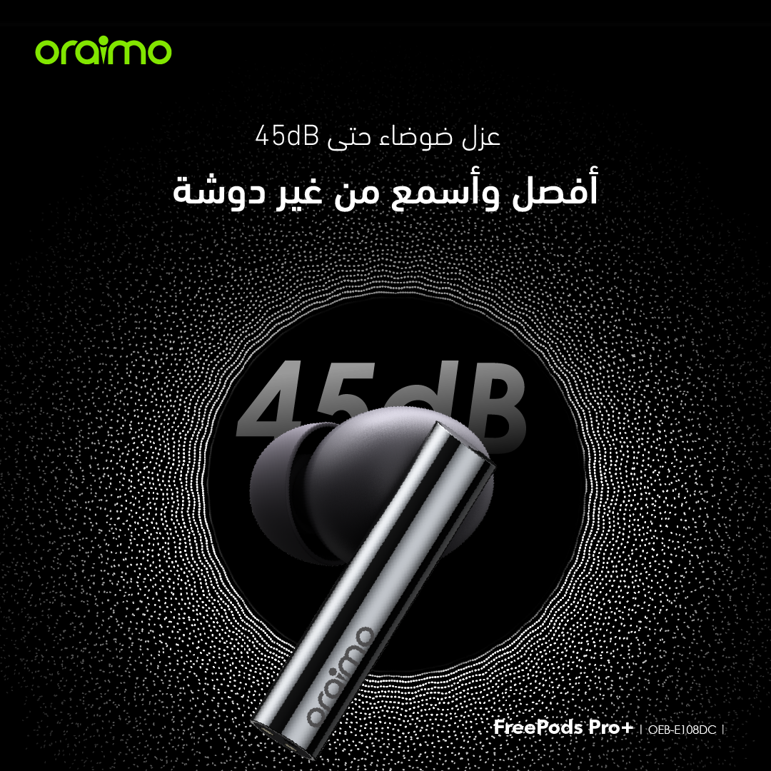 توفر FreePods Pro+ عزل ضوضاء (ِANC) بقدرة 45 ديسيبلِ ، مما يقضي على الضوضاء بسهولة، مما يسمح لك بالانغماس في الصوت . يمكنك ضبط عزل ضوضاء (ِANC) باستخدام تطبيق oraimo Sound لتحقيق تجربة صوتية مريحة.