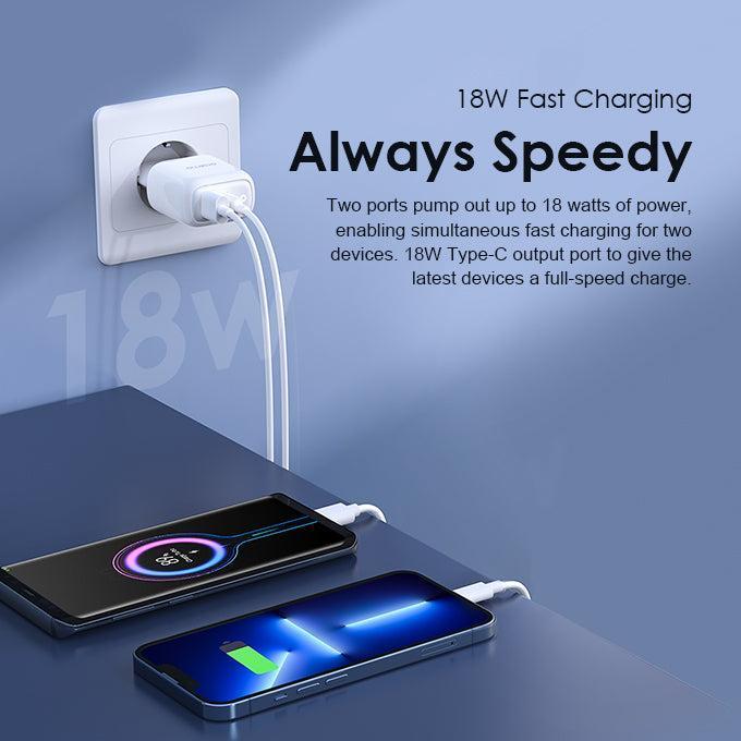 يضخ منفذان ما يصل إلى 18 واط من الطاقة، مما يتيح الشحن السريع المتزامن لجهازين. منفذ إخراج من النوع C بقدرة 18 واط ليمنح أحدث الأجهزة شحنًا بأقصى سرعة.