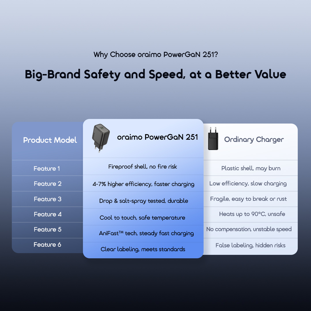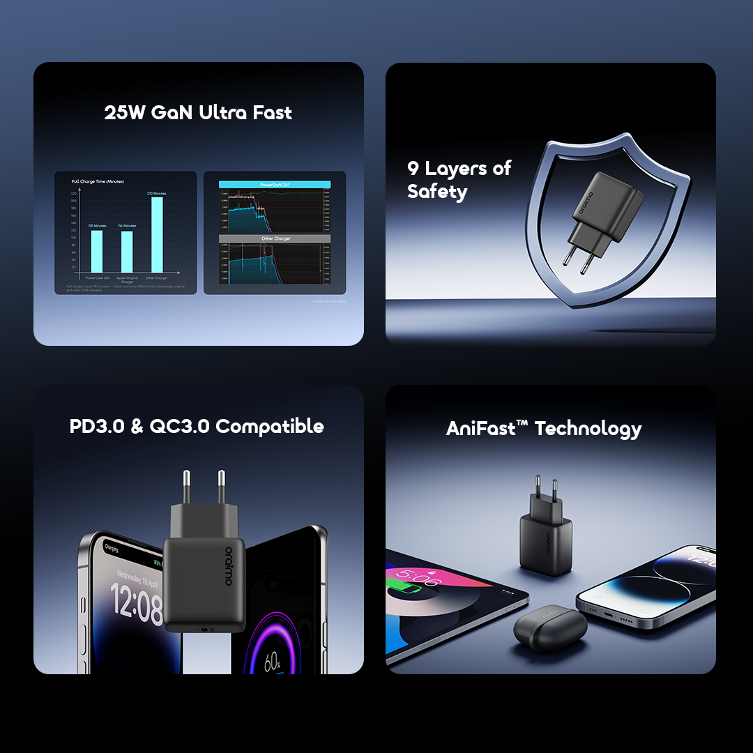 بفضل تقنية GaN المتطورة، يوفر هذا الشاحن الصغير طاقة شحن فائقة السرعة بقدرة 25 واط، مما يضمن شحن أجهزتك بسرعة دون شغل مساحة إضافية.