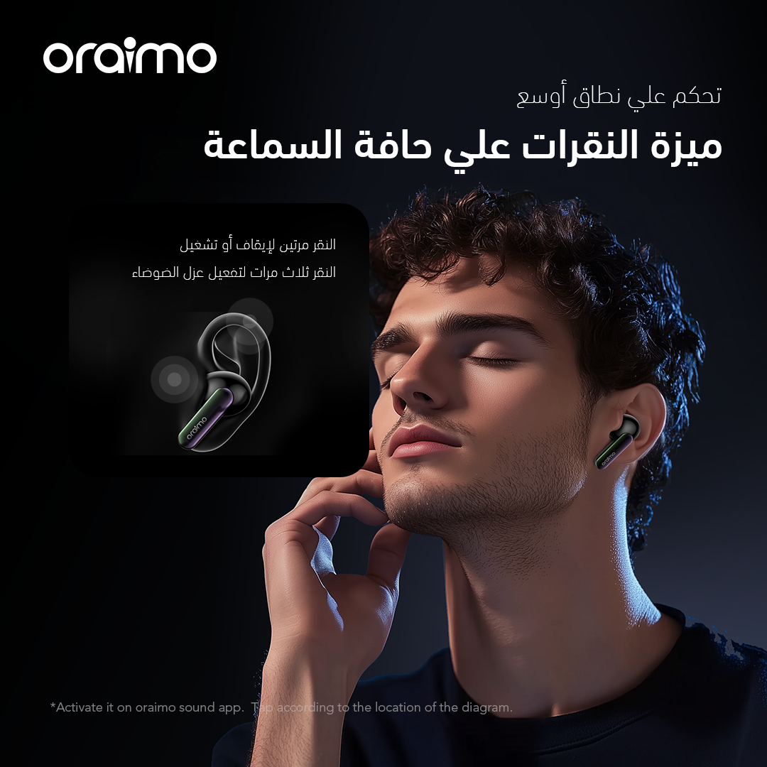 لمسة مزدوجة: إيقاف/تشغيل الموسيقى لمسة ثلاثية: تبديل وضع إلغاء الضوضاء ANC *قم بتفعيل هذه الخاصية عبر تطبيق oraimo sound. اتبع التعليمات حسب الموقع الموضح في الرسم.
