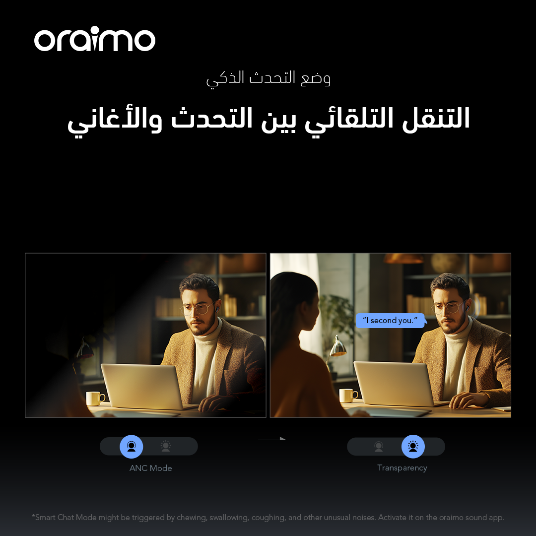 *قد يتم تفعيل وضع المحادثة الذكية عند المضغ أو البلع أو السعال وأصوات غير معتادة أخرى. قم بتفعيله في تطبيق oraimo sound.